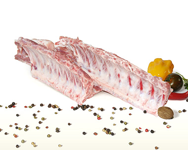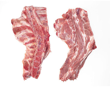 Element półtuszy wieprzowej odcięty z dolnymi końcami żeber oraz częścią przepołowionego mostka w kształcie prostokąta.
